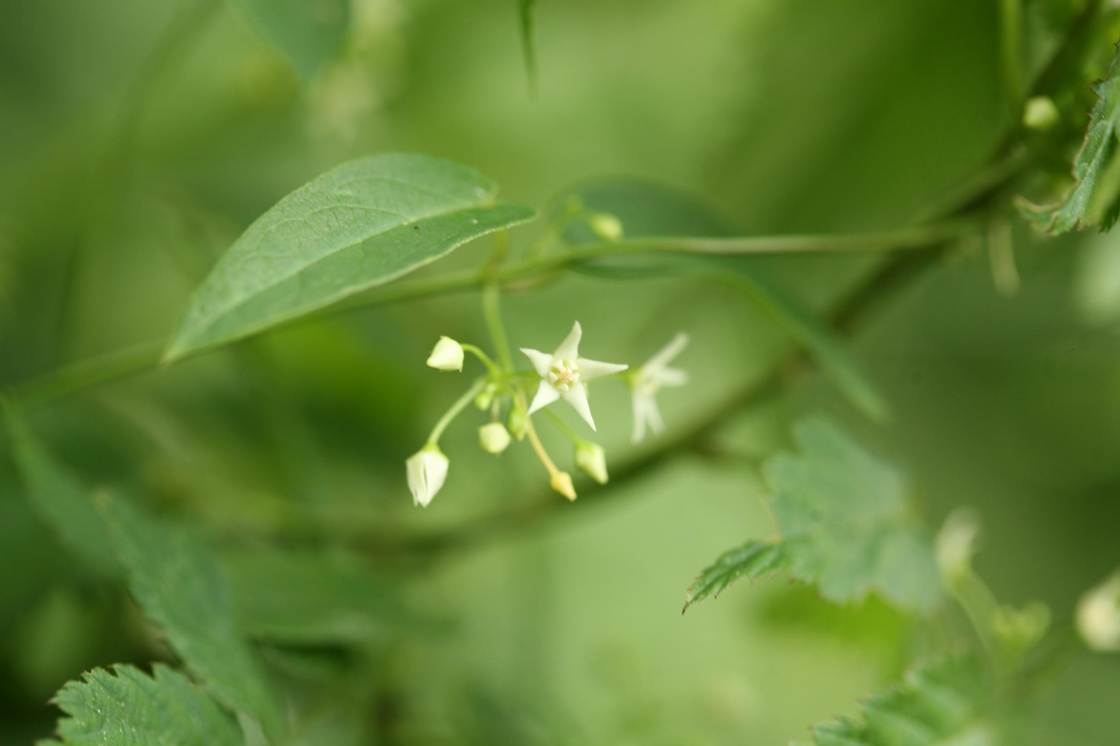 5~7월에 흰색 꽃이 핀다. 꽃차례는 원줄기 끝과 윗부분의 잎겨드랑이에서 나와 산모양으로 달린다.