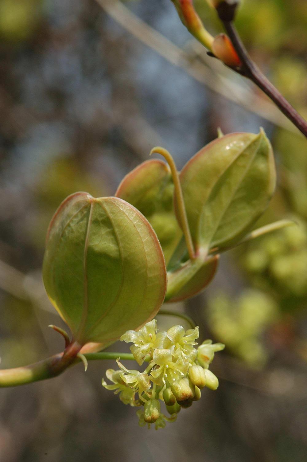 개화기 : 5월,6월,7월잎은 어긋나기하며 긴 타원형이고 끝이 뾰족하다. 5~7개의 잎 맥이 있으며 가장자리가 밋밋하다. 잎 표면은 녹색으로 털이 없으나 뒷면 맥위에 잔돌기가 있는 것도 있다. 잎자루 밑부분에 턱잎이 변한 덩굴손이 있다.