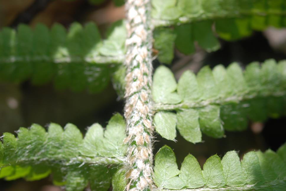 개화기 : 8월,7월잎은 단단한 편이고 깃털모양으로 갈라져 있다. 잎자루는 볏짚색으로 잎보다 길이가 약간 짧고, 비늘조각이 많이 붙어 있다. 비늘조각은 광택이 있는 진한 갈색이거나 검정색으로 뾰족한 형태이다.