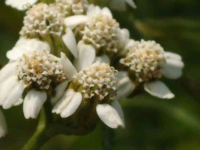 꽃은 6~9월에 피고 흰색 또는 연한 홍색이다. 혀꽃은 암꽃으로서 옆으로 퍼지며 끝이 얕게 3개로 갈라진다. 꽃잎이 서로 달라붙어 대롱 모양의 작은 꽃은 암수가 모두 있고 끝이 5개로 갈라진다.
