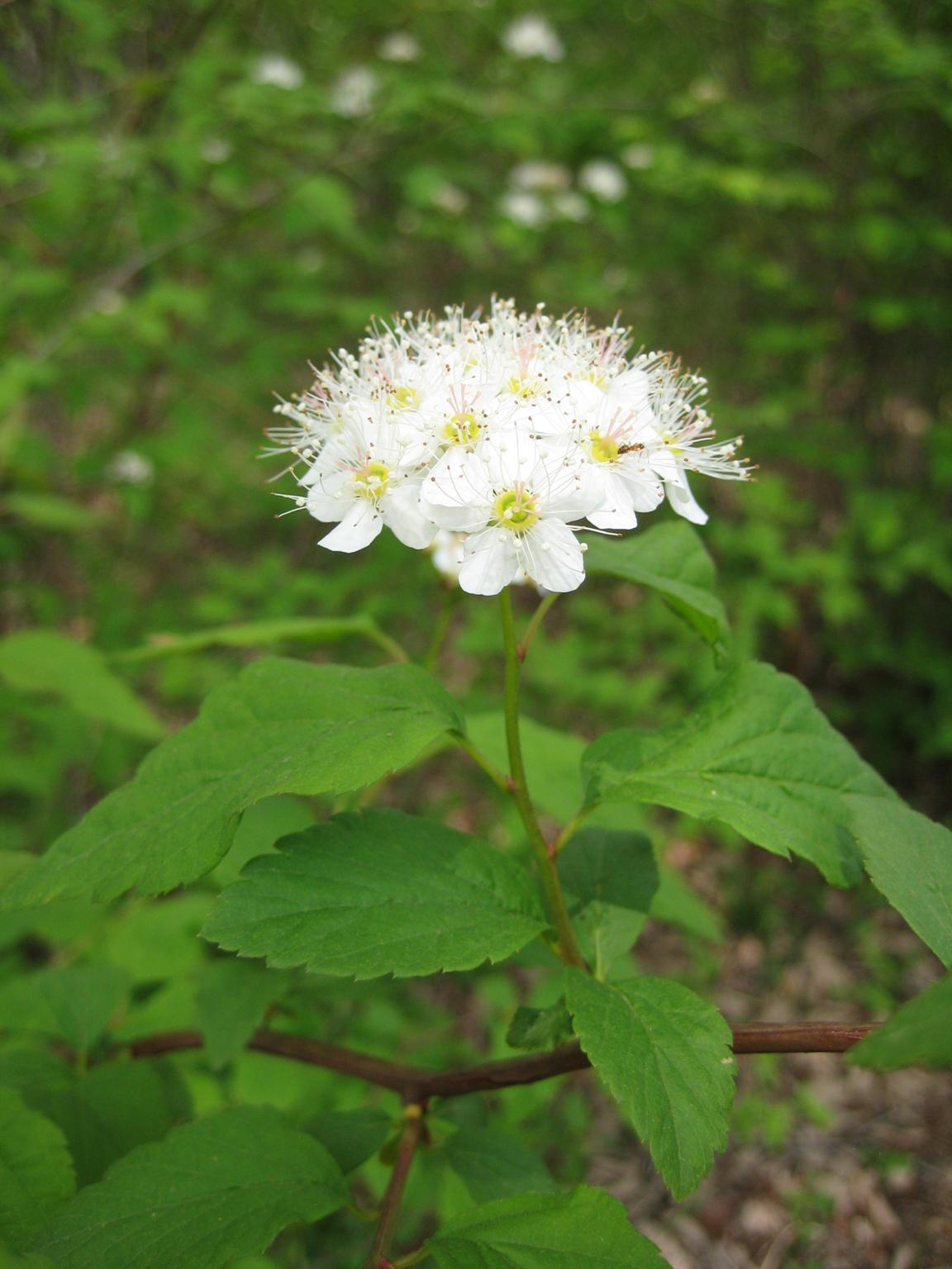 꽃은 5월 말~6월 말에 피며 흰색이다. 암술과 수술이 함께 있는 꽃으로서 새가지 끝에 15~20개가 우산모양꽃차례에 달린다. 꽃차례에 털이 없고 수술의 길이는 꽃부리와 비슷하다.