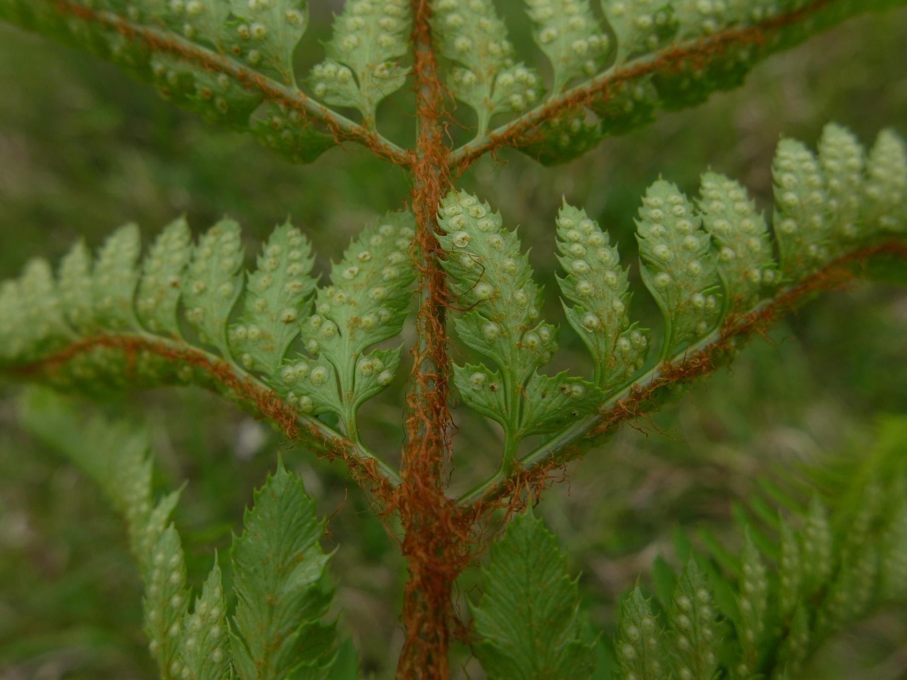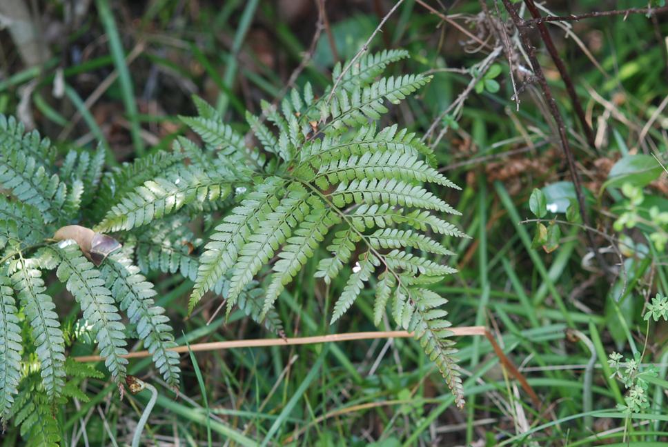 개화기 : 6월잎자루의 길이는 잎몸의 절반 정도이고, 색은 연한 초록색이거나 볏짚색이다. 또한, 앞쪽에 홈이 파여 있고 밑부분은 갈색 또는 황갈색 비늘조각이 촘촘하게 퍼져 있다. 그러나 윗부분은 선모양 비늘 조각이 드문드문 돋아 있다. 잎몸은 긴 타원 같은 달걀 모양이고 끝이 뾰족하며 3회 깃털 모양으로 갈라진다. 깃털 모양 조각은 12~15쌍이고 짧은 대가 있다. 홀씨주머니 무리가 달리지 않은 것은 앞뒤의 색이 같다. 겉면에는 비늘조각이 거의 없지만 뒷면에는 드문드문 있으며 갈라진 조각에는 뾰족한 톱니가 있다.