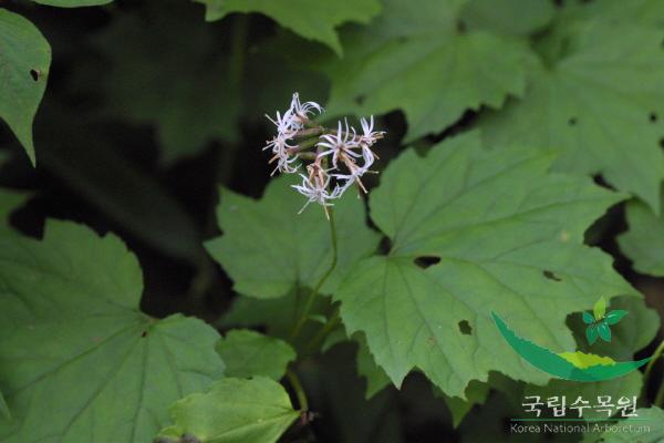 개화기 : 8월,10월,9월잎은 잎자루가 길고 원줄기 밑에서 촘촘하게 나온다. 달걀 모양, 심장 모양 또는 콩팥 모양이다. 양면에 긴 털이 있으며 5개로 얕게 갈라진다. 갈라진 조각의 끝이 뭉뚝하며 꼭대기 조각이 길다.