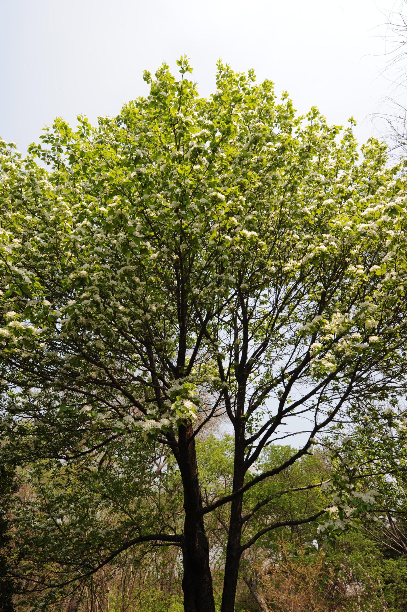 꽃은 4~5월에 하얀색으로 피고 짧은 가지 끝에 5~9개가 모여 달린다. 꽃자루에는 잔털이 있고, 꽃잎 전체는 연한 붉은색이다. 꽃받침조각은 달걀 모양이고 톱니가 없으며 둔두이다. 양면에는 하얀 털이 촘촘히 나 있다. 꽃잎은 둥근 모양, 거꿀달걀모양 또는 넓은 달걀 모양이다. 꽃가루주머니는 자줏빛이 도는 붉은색이다. 암술대는 2~3개이고 털이 없다.