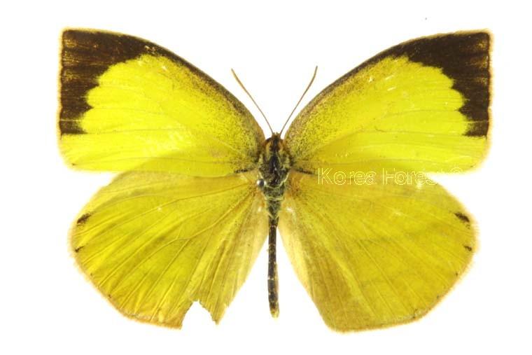 날개는 진노랑색이며, 앞날개 끝부분에 검은 테두리가 넓게 발달되어 있다. 그 테두리의 안쪽 중간 부분이 굴곡지며 파여 있다.