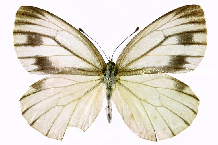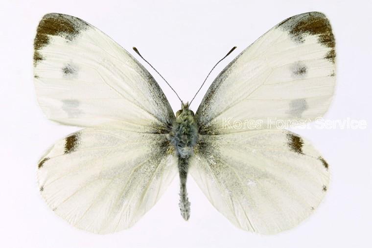 날개는 전체적으로 하얀색이고, 앞날개의 끝 부분과 무늬처럼 갈라져 있는 맥은 검은색이다. 봄형은 여름형보다 작고, 날개 윗면의 검은 무늬도 약하게 나타난다. 그러나 아랫면은 무늬처럼 갈라져 있는 맥을 따라 검은색 비늘이 발달해있다.