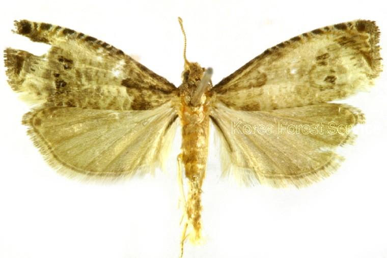 앞날개가 시작되는 부분의 무늬는 앞 가장자리 1/3지점에서 출발하여 뒷 가장자리 1/3까지 나타나 있으며, 진한 갈색 비늘 조각으로 덮여 있다. 그 무늬의 바깥쪽은 넓게 흰색을 띠고 있으며, 흑갈색으로 튀어 나와 있는 삼각형 무늬가 뚜렷하다. 날개 뒤쪽 끝 부분도 흰색을 띠는데, 여기에는 갈색 비늘 조각이 섞여 있다. 뒷날개는 갈색이다.