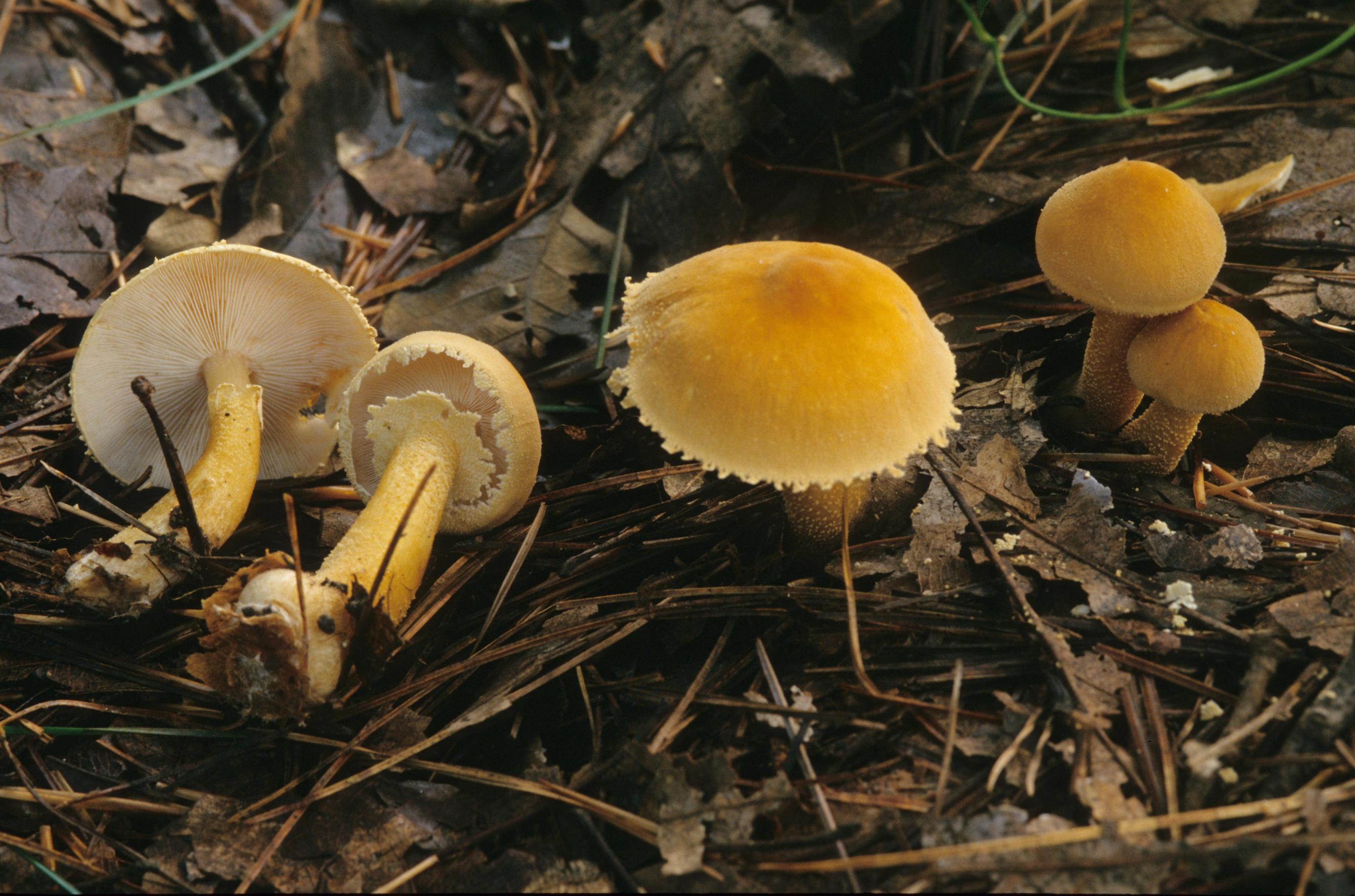 일반특징 버섯의 자실체는 크게 갓, 주름, 대로 나누어진다. 황갈색낭피버섯의 갓은 원뿔 모양이고 편평하게 된다. 그 조직은 황색이다. 주름은 황색이고 올린 주름살이며 빽빽하다. 대는 반투명한 막의 턱받이가 있다. 숲속의 땅에서 한곳에 몰려난다.분포지역 : 뱐산반도발생계절 : 여름~가을