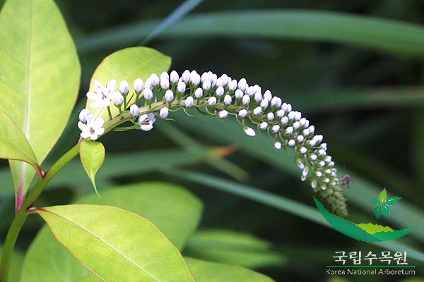 꽃은 6~8월에 흰색 꽃이 피는데 줄기 꼭대기에서 꼬리처럼 옆으로 굽은 총상꽃차례에 모여서 핀다. 씨방은 1개이고 수술은 5개로 꽃차례에 털이 있고 암술대는 수술보다 짧다.