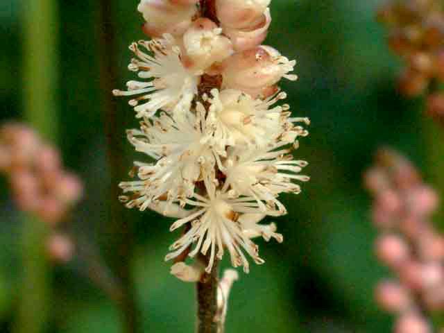꽃은 8월에 하얀색으로 원줄기 윗부분의 큰 원뿔모양꽃차례에 어긋나게 붙어 달린다. 꽃차례에는 짧은 털과 분비샘이 발달한 털이 촘촘하게 난다. 꽃받침조각은 4~5개이고 하얀색이며 타원 모양 또는 달걀 모양이고 꽃잎처럼 생겼다. 꽃잎은 3~4개이고 하얀색이며 깊게 두 개로 갈라진다. 암그루에는 양성꽃이 있으나 수그루에서는 암술이 거의 없어진다.