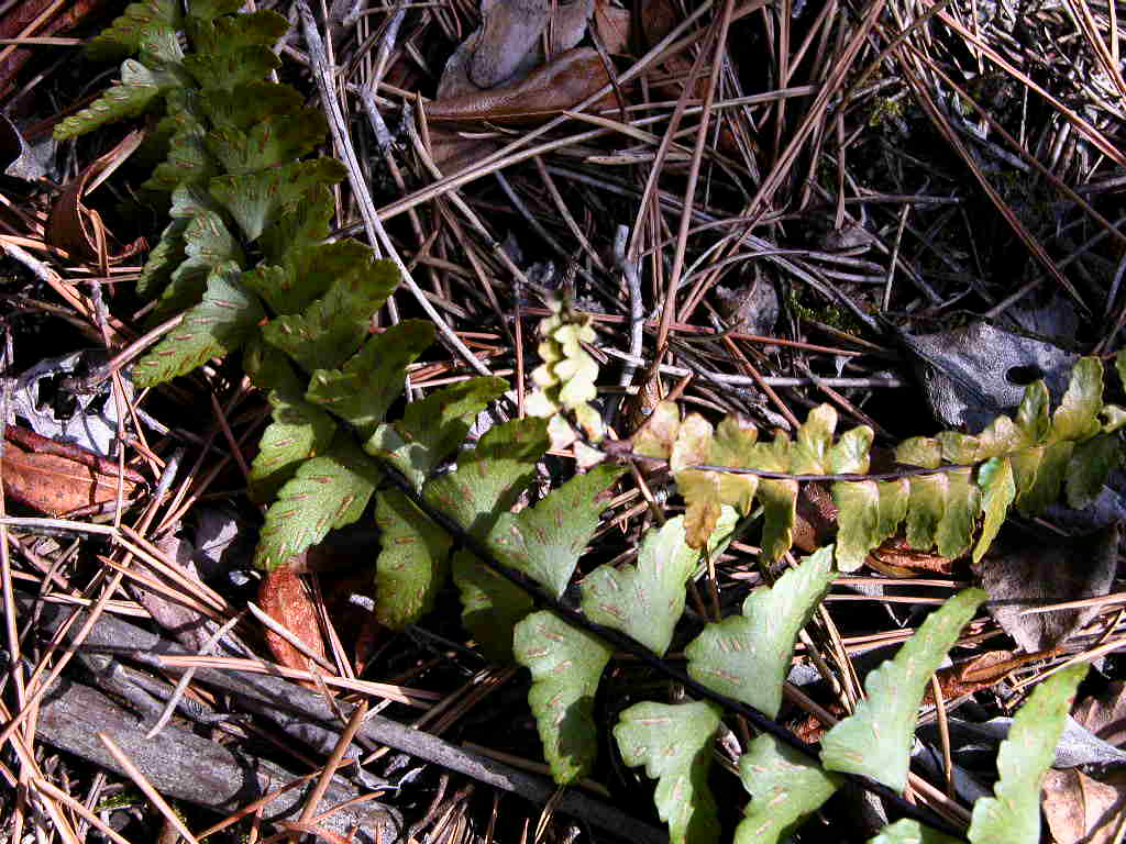 개화기 : 8월,9월잎자루는 연한 초록색이며 부채 모양의 비늘 조각과 분비샘이 발달한 털이 있다. 잎은 2회 깃털 모양으로 갈라지며 맥이 뚜렷하지 않다. 홀씨주머니 무리는 갈라진 잎의 가운데에 모여 있다. 홀씨주머니 무리를 덮고 있는 막은 반투명하고 잎 가장자리는 갈라진다.